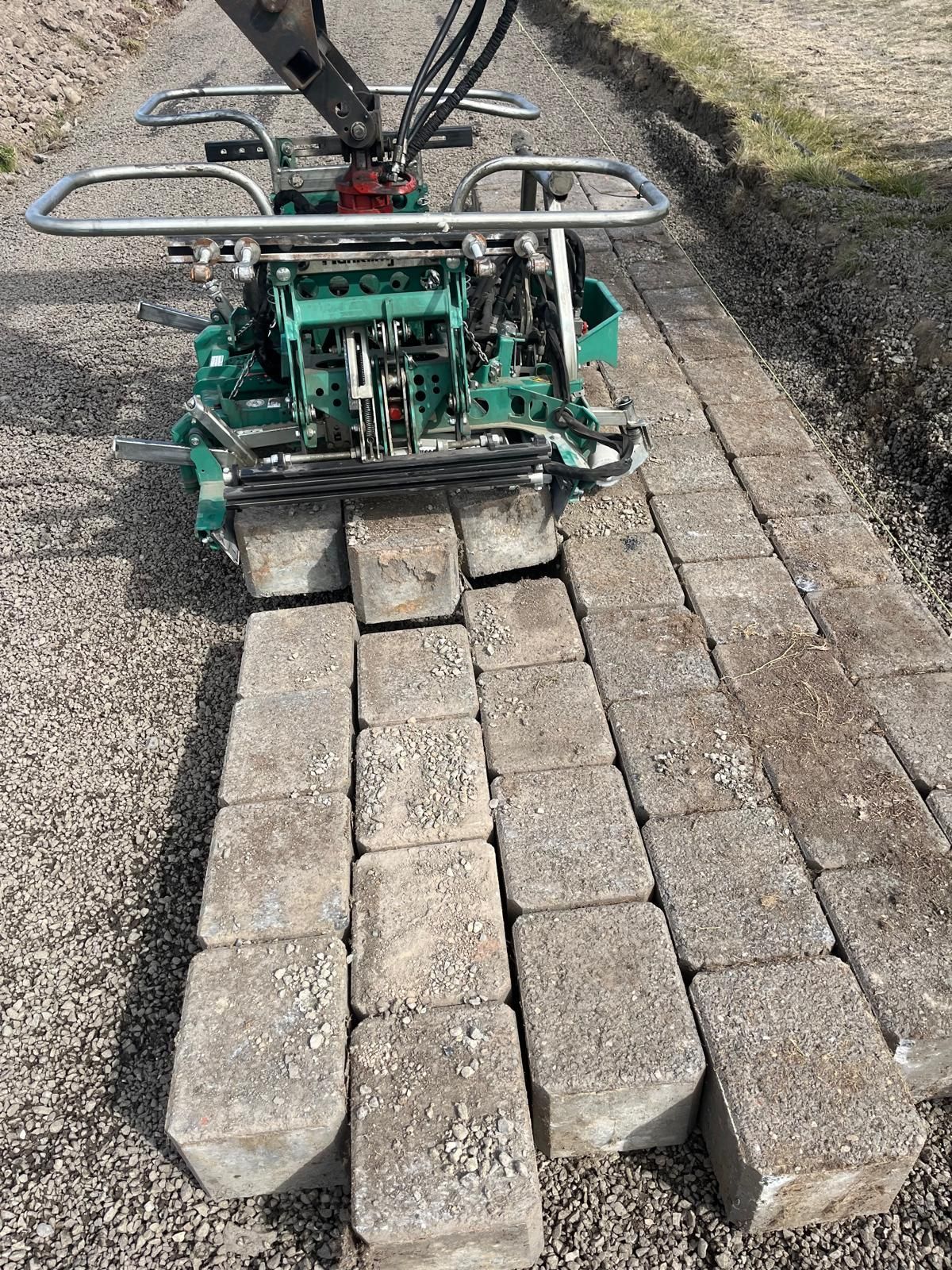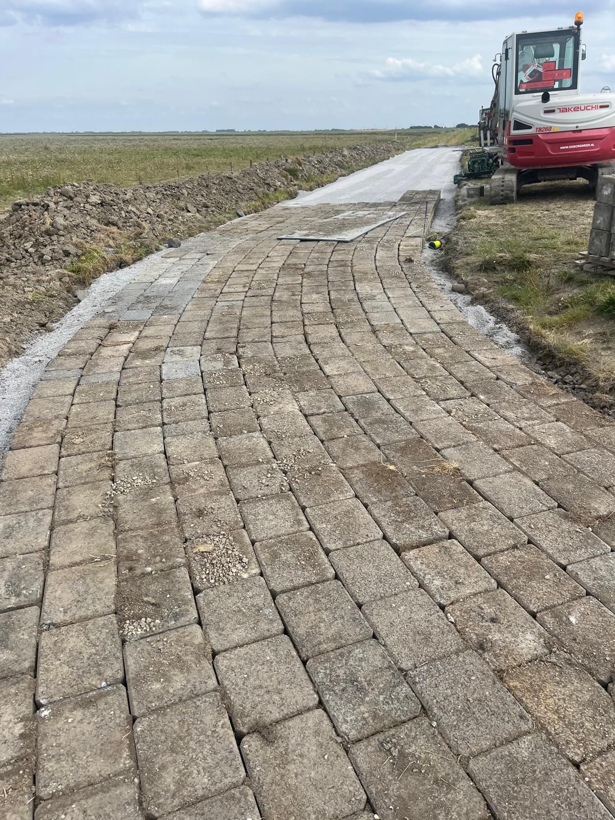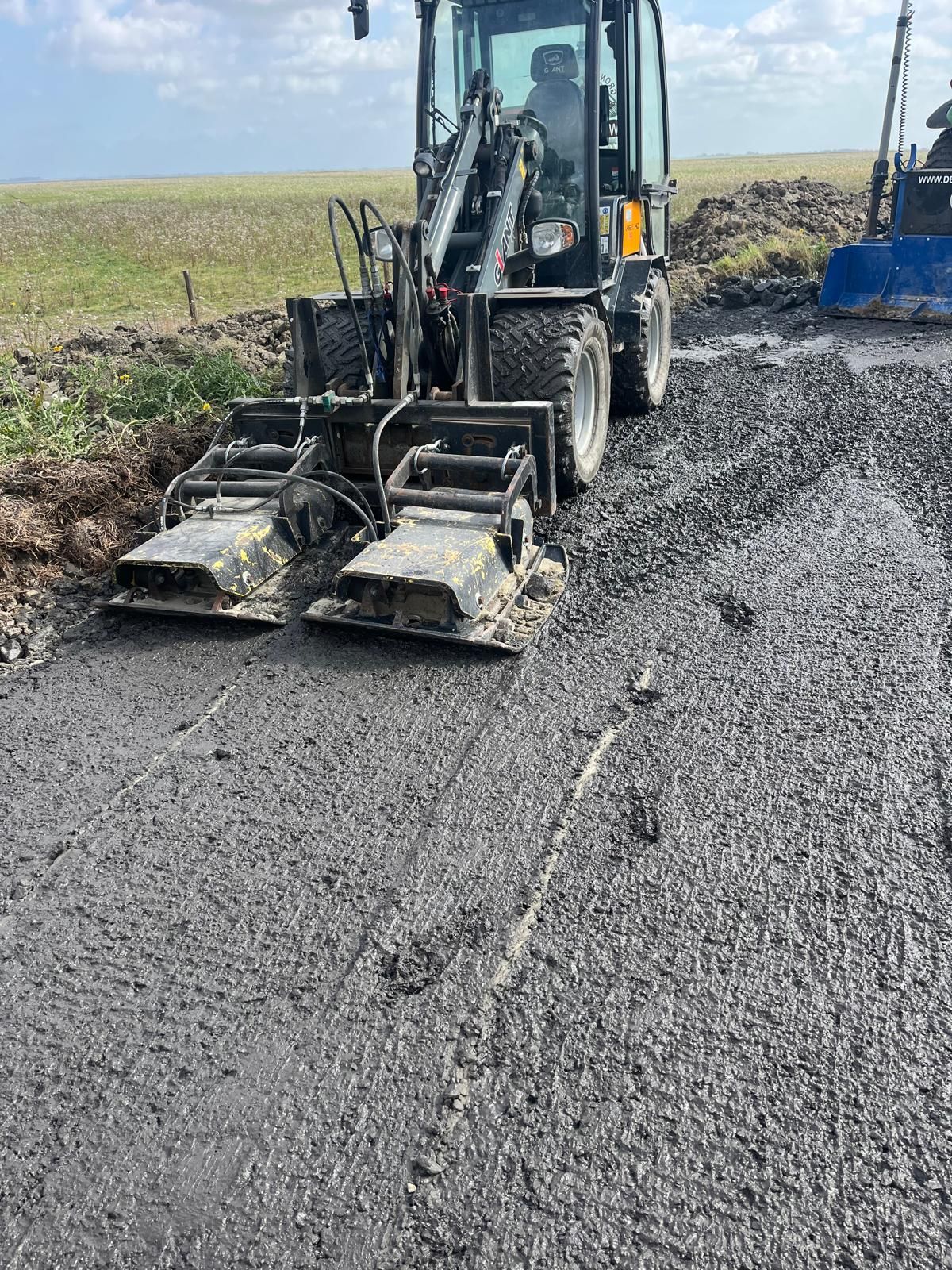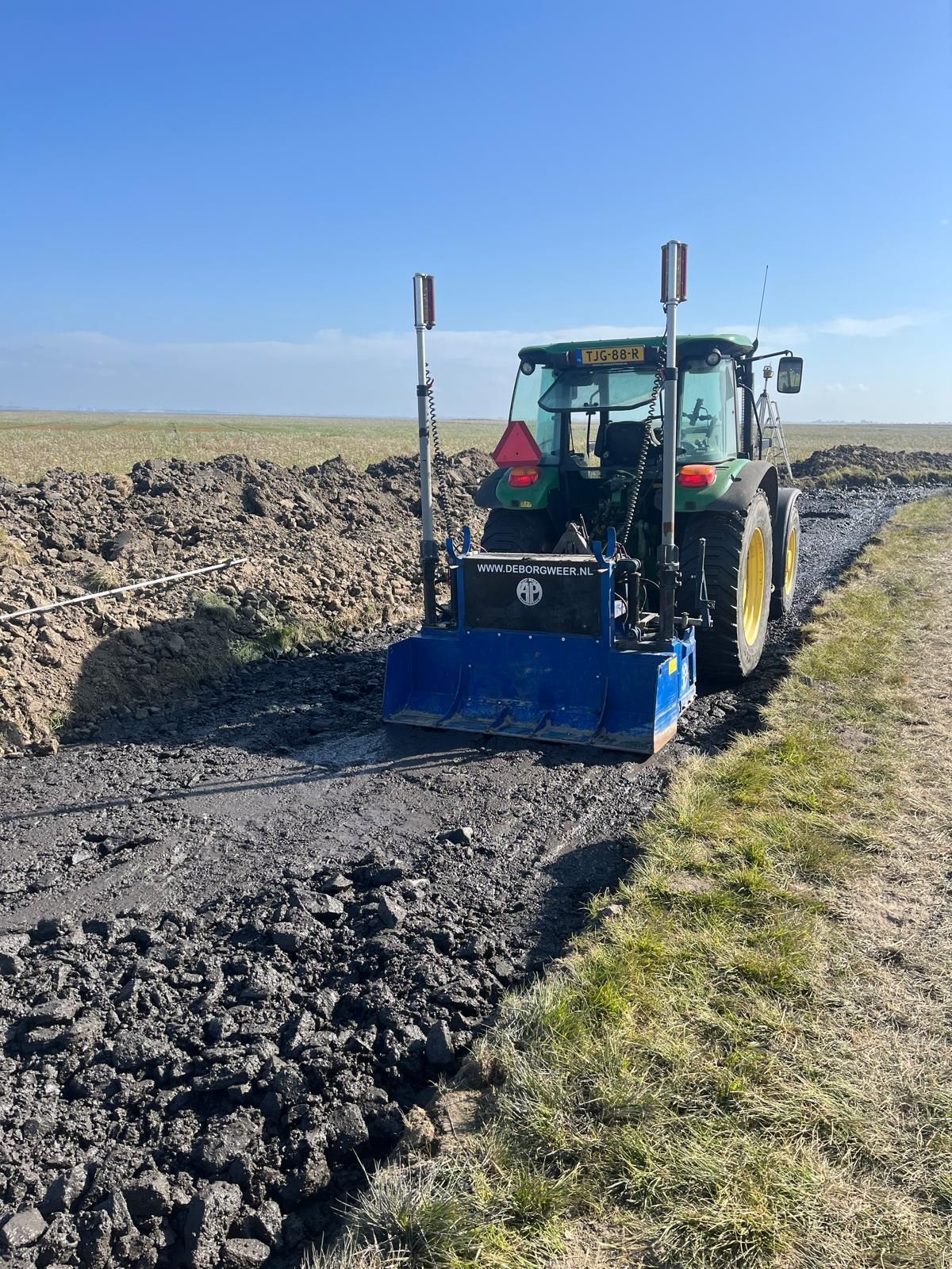 Lasergestuurd egaliseren, verdichten en vervolgens het hergebruikte split uit de dijk in de onderhoudsweg aangebracht